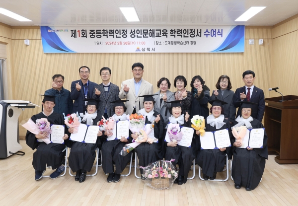 삼척시는 2월28일 수요일 도계평생학습센터 강당에서 박상수 시장과 양희 전 삼척시의회 부의장을 비롯한 내빈과 교사, 가족 등 50여명이 참석한 가운데 제1회 중학학력인정 성인문해교실 학력인증서 수여식을 개최하였 다.
