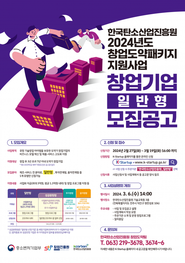 사업 참여를 희망하는 기업은 3월 19일 오후 4시까지 K-Startup 누리집을 통해 신청하면 되고 주관기관으로 한국탄소산업진흥원을 선택하면 된다.