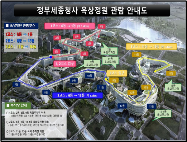 세종청사 옥상정원 방문을 원하는 개인·단체는 네이버 온라인 예약 또는 당일 현장방문해 접수하면 무료로 관람 신청이 가능하다.