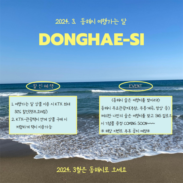 또한, 3월 중 주요관광지를 제외한 나만의 숨은 관광지를 찾아 SNS 업로드 및 동해관광 SNS 태그 시 추첨을 통해 기념품 증정 이벤트를 실시한다.