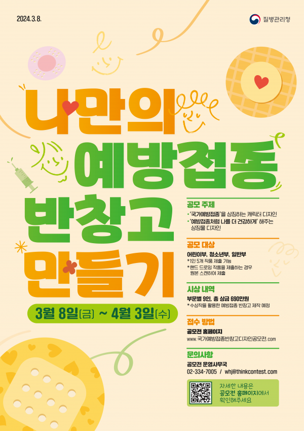 [AANEWS] 질병관리청은 예방접종 중요성을 널리 알리고 국민들의 예방접종에 대한 관심을 높이기 위해 3월 8일부터 4월 3일까지 예방접종 반창고 디자인 공모전을 개최한다고 밝혔다.