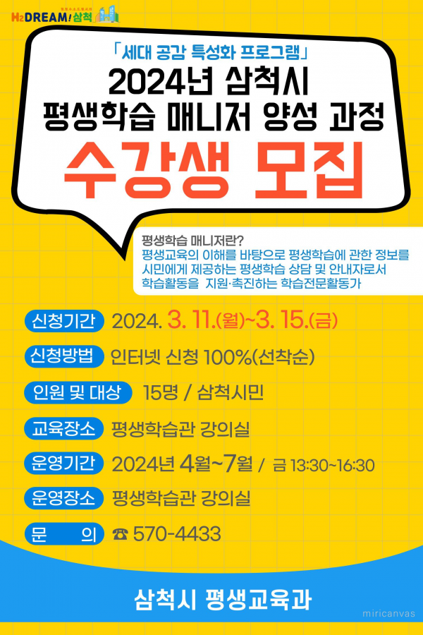 [AANEWS] 삼척시는 3월 11일부터 15일까지 삼척시민을 대상으로 ‘2024년 삼척시 평생학습 매니저 양성과정’ 수강생을 모집한다고 밝혔다.