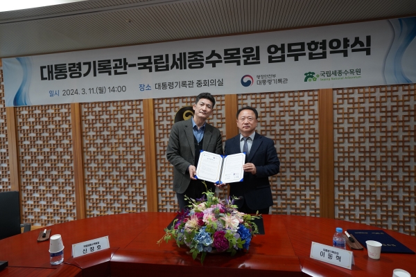 신창호 국립세종수목원장은 “이번 업무협약을 계기로 대통령기록관과 긴밀하게 협력해 사회적 가치 실현에 앞장서겠다”고 말했다.