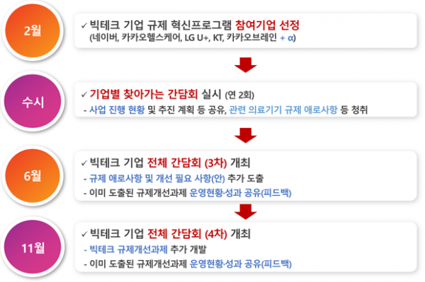 식약처는 ➊각 업체의 사업 진행현황 및 추진 계획 등 파악, ➋규제개선과제 추가 발굴, ➌그간 규제개선 운영성과 공유 등을 위해 3월부터 기업별 찾아가는 간담회를 개최하며 반기별로 규제혁신 프로그램에 참여하는 모든 빅테크 기업이 모여 전체 간담회를 개최할 예정이다.