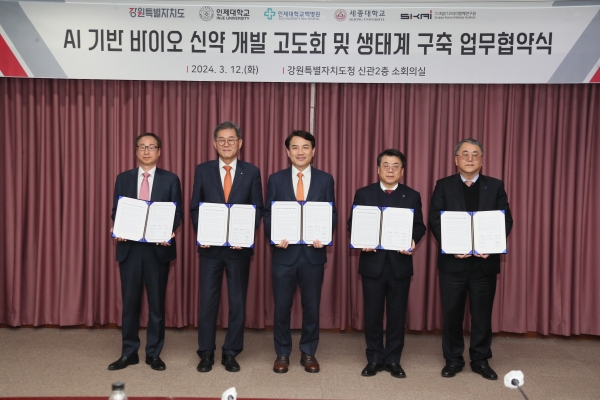 [AANEWS] 강원특별자치도는 3. 12. 도청에서 인제대학교, 인제대학교 백병원, 세종대학교, 스크립스코리아항체연구원과 함께 업무협약을 체결했다.