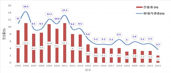 간흡충을 포함한 유행지역 전체 장내기생충 감염률은 2012년 9.4%에서 ’23년 3.7%로 크게 감소했으며 간흡충 감염률은 2.0%로 나타났다.