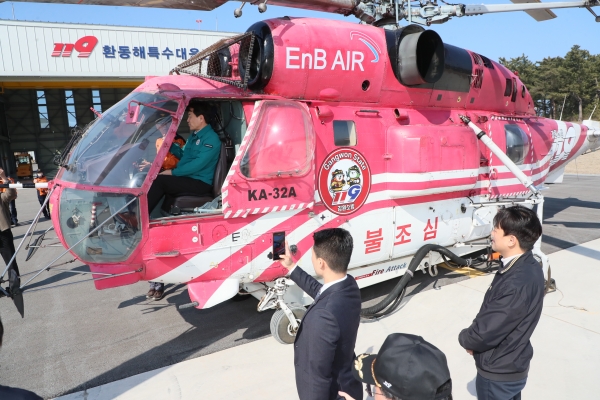 김진태 강원특별자치도지사는 신규 임차 헬기가 배치되어 있는 환동해특수대응단을 직접 방문해 특수장비와 격납고에 배치되어 있는 헬기, 계류장 등을 확인했고 환동해특수대응단 직원들에게 “이번에 추가로 도입된 대형소방헬기는 산불 초기 진화를 위해 도입된 것”며 “헬기가 적기에 안전하게 사용될 수 있도록 사전 점검에 만전을 기해줄 것”을 당부했다.