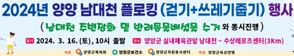 [AANEWS] 환경보호와 건강증진을 위한 ‘2024년 남대천 플로킹 행사’가 오는 16일 오전 10시에 양양남대천 일원에서 열린다.