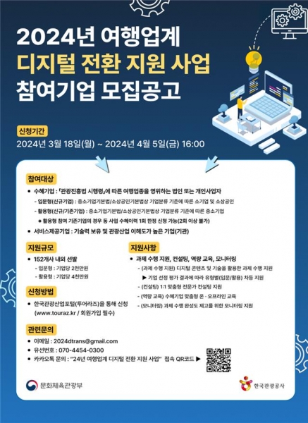 [AANEWS] 문화체육관광부와 한국관광공사는 금일 18일부터 4월 5일까지 ‘2024년 여행업계 디지털 전환 지원 사업’에 참여할 기업을 모집한다.