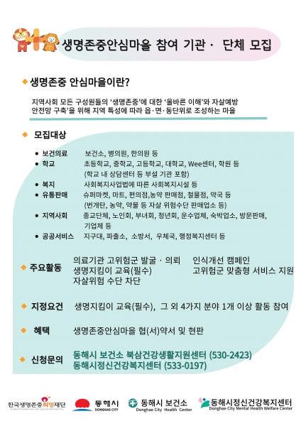 [AANEWS] 동해시가 생명존중 안심마을 본격 운영을 위한 참여기관 연중 상시 모집에 나섰다고 밝혔다.