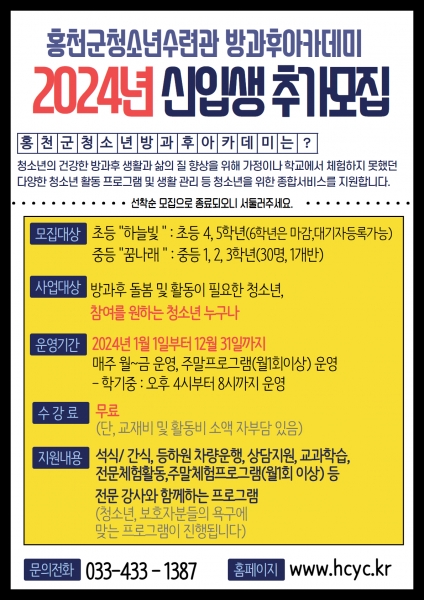 [AANEWS] 홍천군청소년수련관 방과후아카데미에서 2024년 활동을 함께할 신입생을 추가 모집한다고 밝혔다.