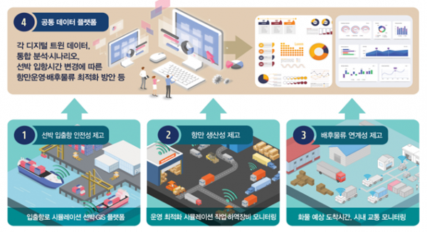 ‘디지털트윈’이란 3D 기술 등을 활용해 현실세계를 가상세계에 구현하는 기술로 항만 물류에 적용되면 육해상 전 구간에서 발생하는 데이터의 실시간 공유와 분석 시뮬레이션을 통해 최적의 항만 물류 흐름을 도출해낼 수 있다.