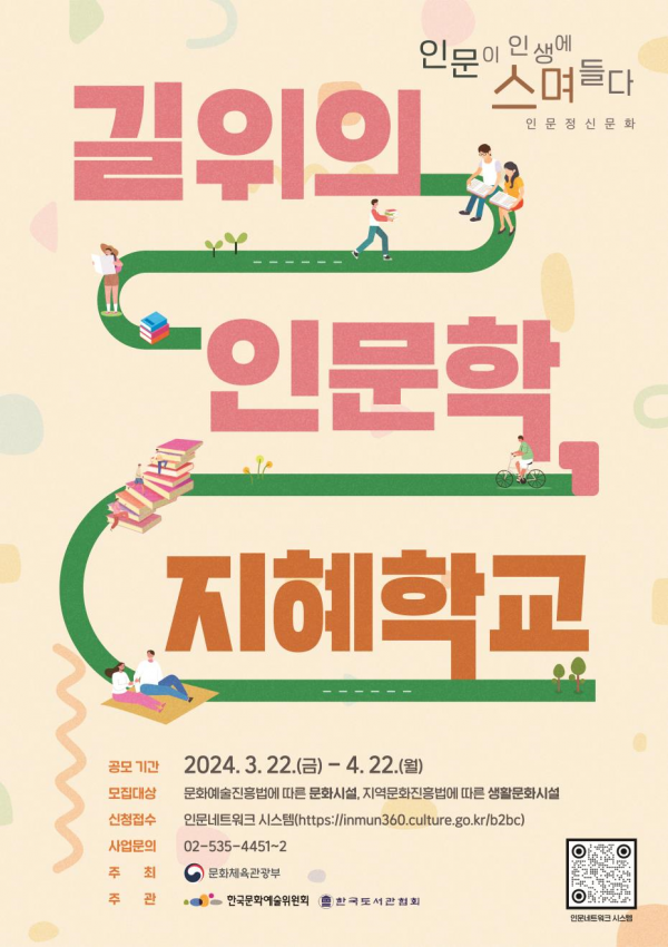 [AANEWS] 문화체육관광부는 한국문화예술위원회와 함께 ‘길 위의 인문학’과 ‘지혜학교’ 프로그램을 운영할 문화시설과 인문프로그램을 3월 22일부터 4월 22일까지 ‘인문네트워크’에서 공개 모집한다.