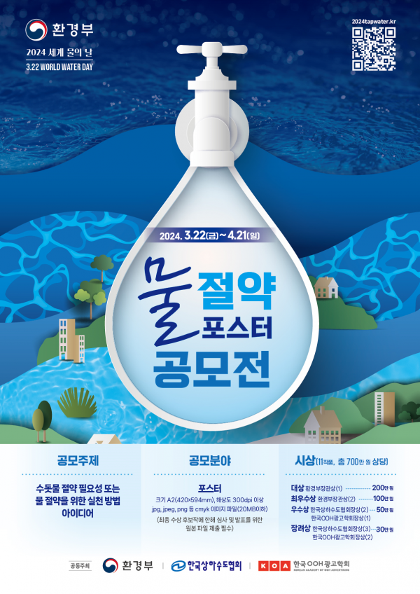 [AANEWS] 환경부는 ‘2024년 세계 물의 날’을 맞이해 수돗물의 중요성에 대한 국민의 공감대를 형성하고 물 절약 생활 실천을 유도하기 위해 3월 22일부터 4월 21일까지 ‘물 절약 포스터 공모전’을 개최한다.