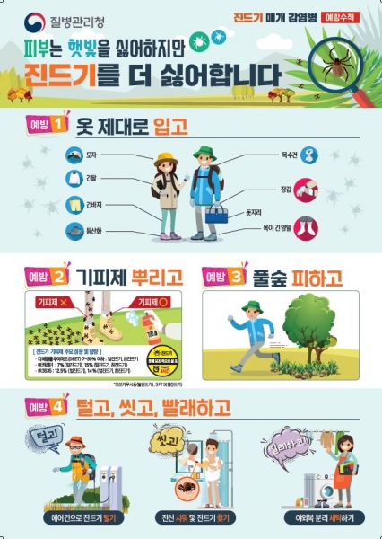 국내에서 주로 발생하는 진드기 매개 감염병은‘쯔쯔가무시증’과‘중증열성혈소판감소증후군’이며 쯔쯔가무시증은 10~11월, SFTS는 6~10월 중 집중적으로 발생한다.