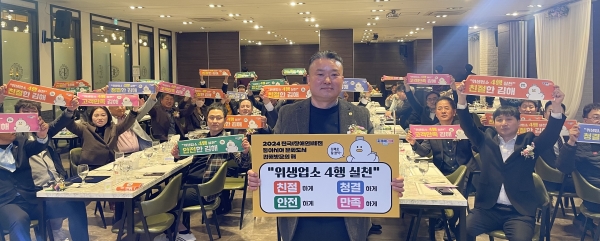 이날 취임한 이영림 대한제과협회 김해시지부장은 정래화 외식업중앙회 김해시지부장 직무대행의 지명을 받아 4행 실천 문구와 함께 인증사진을 촬영하는 4행 실천 챌린지에 동참했다.