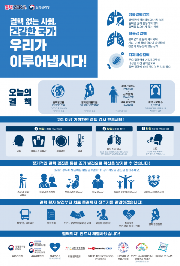 결핵예방의 날 기념행사 개최 한편 질병관리청은 3월 24일 결핵예방의 날을 맞이해 금일 오전 10시 30분 서울 서초구 엘타워에서 ‘제14회 결핵예방의 날’ 기념행사를 개최하고 결핵 퇴치를 위한 끊임없는 노력을 다짐했다.