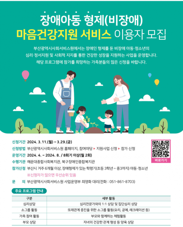 [AANEWS] 부산시는 부산사회서비스원과 함께 올해 신규 사회서비스 시범사업으로 '장애아동 형제 마음건강지원 사업'을 추진한다고 밝혔다.