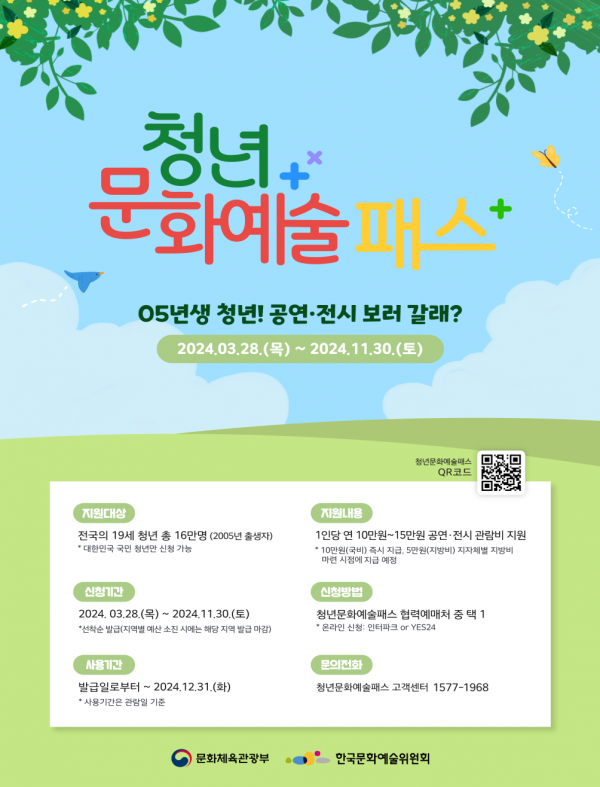 [AANEWS] 문화체육관광부는 한국문화예술위원회와 함께 3월 28일 오전 10시부터 협력예매처인 ‘인터파크’와 ‘예스24’를 통해 ‘청년 문화예술패스’ 신청을 받는다.