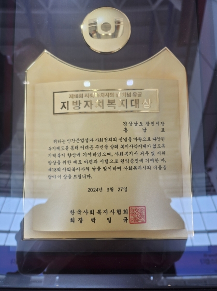 [AANEWS] 창원특례시는 27일 한국사회복지사협회가 주최하고 보건복지부가 후원한 제18회 사회복지사의 날 행사에서 ‘2024 지방자치복지대상’을 수상했다고 밝혔다.