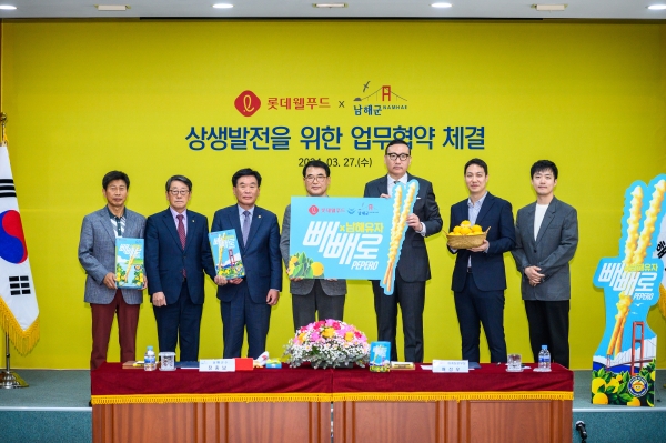 남해군과 롯데웰푸드는 27일 남해군청에서 상생발전을 위한 업무협약을 체결했다.