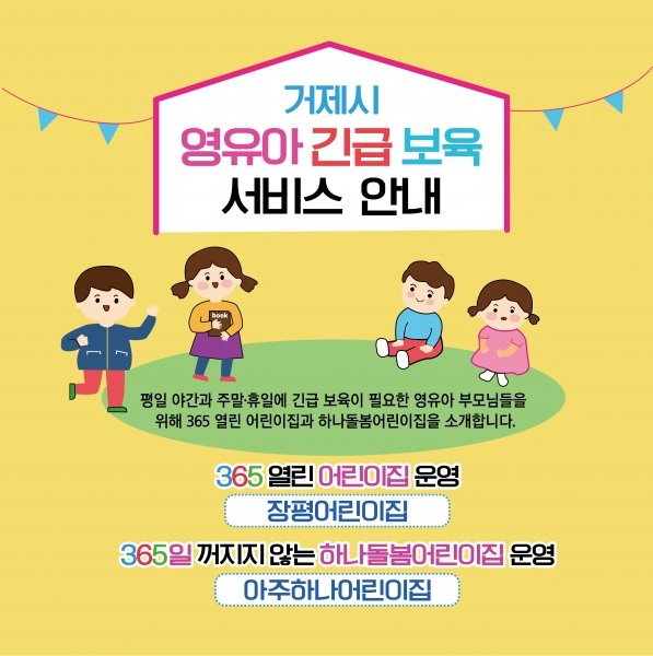 [AANEWS] 거제시는 부모의 긴급한 상황이나 주말 근무 등의 사유로 아이 돌봄이 필요한 가정을 위해 야간·주말에도 어린이집에 아이를 안심하고 맡길 수 있는 긴급보육 서비스를 확대한다.
