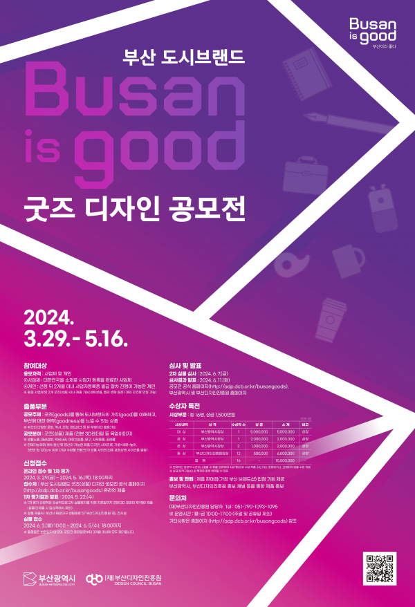 참가 신청은 3월 29일부터 5월 16일 오후 6시까지 ‘부산 도시브랜드 굿즈 디자인 공모전’ 공식 누리집을 통해 온라인으로 가능하다.