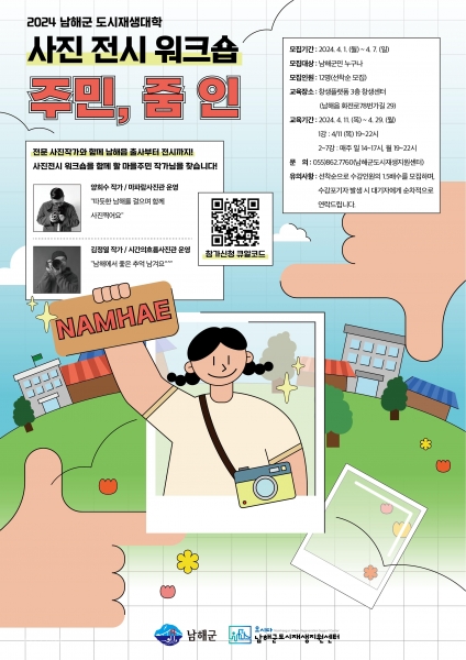 [AANEWS] 남해군도시재생지원센터는 지역주민과 함께 하는 사진전시 워크숍 ‘주민, 줌 인’의 수강생을 4월 7일까지 모집한다고 밝혔다.