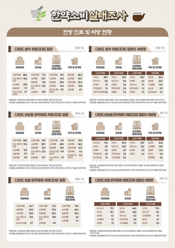 조사 결과 한방병원과 한의원, 요양·병원은 근골격계통 질환에 첩약과 보험· 비보험 한약제제를 처방하는 경우가 가장 많았고 약국·한약방은 호흡계통 질환에 첩약과 비보험 한약제제를 조제하는 경우가 가장 많았다.