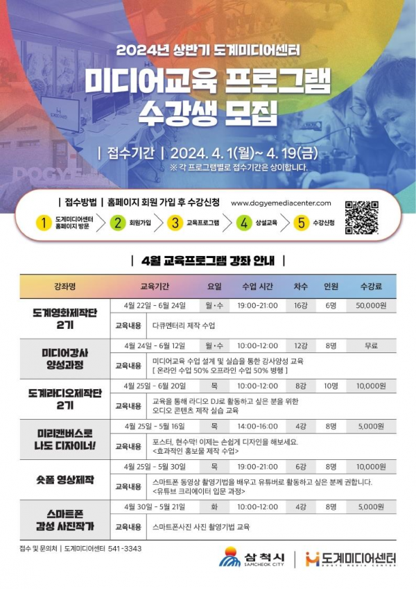 [AANEWS] 삼척시는 4월 1일부터 19일까지 삼척시민 및 폐광지역 주민을 대상으로 2024년 상반기 도계미디어센터 교육프로그램 수강생을 모집한다고 밝혔다.