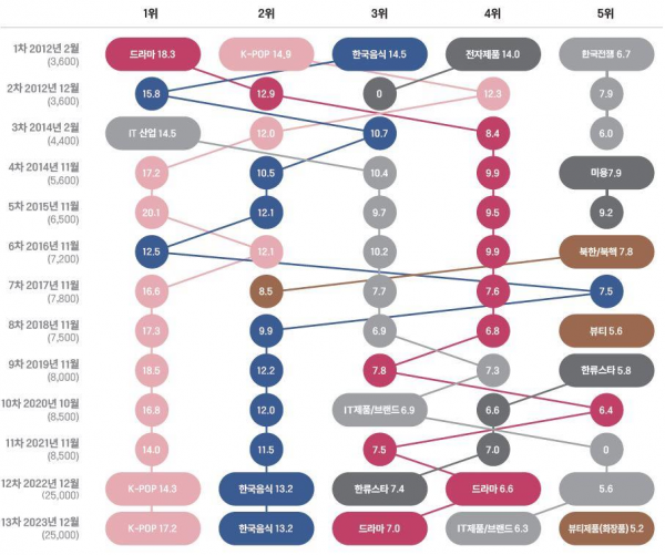 그 뒤로는 한국 음식, 드라마, 정보기술 제품/브랜드, 미용 제품 순이었다.