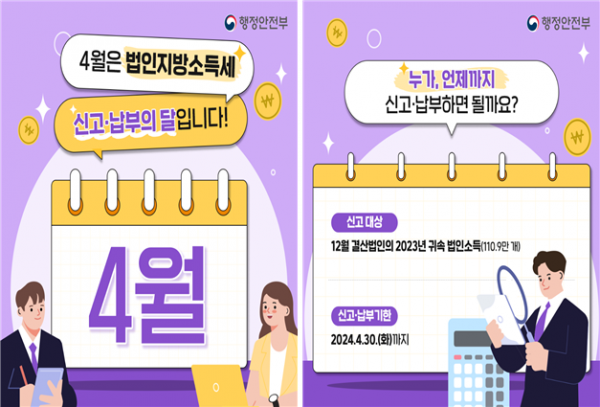 [AANEWS] 행정안전부는 전체 법인의 94%에 달하는 12월 결산법인의 2023년 귀속 소득에 대한 법인지방소득세 집중신고기간을 4월 1일부터 오는 4월30일까지 운영한다고 밝혔다.