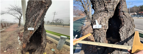 위험성 정밀안전진단 실시 결과, 부후 심각 판정을 받은 가로수 왕벚나무 32주는 이달 중 제거 작업을 완료할 예정이며 느티나무 2주는 수피 복원과 공동 충진 등의 외과수술을 시행할 예정이다.