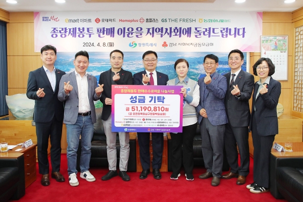 [AANEWS] 창원특례시는 8일 시청 접견실에서 관내 대형유통업체 16개소에서 기탁한 ‘종량제봉투 판매이윤 나눔사업’ 성금 51,190,810원 기탁식을 가졌다고 밝혔다.