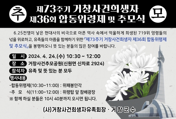[AANEWS] 거창군과 거창사건희생자유족회는 오는 4월 24일 거창사건으로 억울하게 희생된 영령들의 넋을 위로하고 추모하기 위한 제73주기 거창사건희생자 제36회 합동위령제 와 추모식을 거창사건추모공원에서 봉행한다.