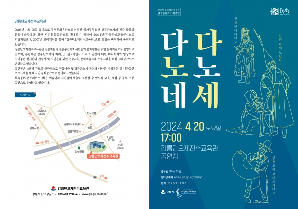 [AANEWS] 강릉단오제전수교육관은 강릉단오제의 전승발전과 공연예술 활성화를 위해 단오콘텐츠기획공연‘다노네, 다노세’를 오는 4월 20일 오후 5시 공연한다.