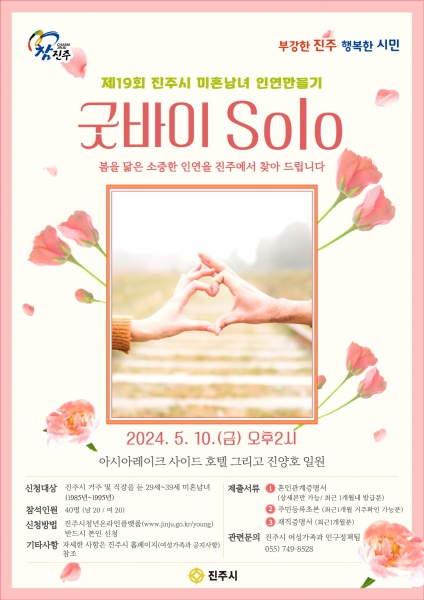 이번 행사는 ‘굿바이 SOLO’를 주제로 커플 레크레이션, 커플댄스, 스탠딩 토크, 감성코드 찾기 등 다양한 활동을 통해 서로를 알아가는 시간을 가질 예정이며 행사 종료 후에도 참가자들의 온라인 모임이나 진주시 관광을 소재로 한 이벤트 등을 통해 행사의 지속 효과를 이어갈 계획이다.