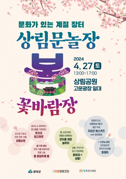 [AANEWS] 함양군은 빈둥협동조합과 함께 오는 4월 27일 오후 1시부터 5시까지 상림 고운광장에서 ‘상림 문화놀이장날’ 4월 행사 ‘봄 꽃바람장’을 연다고 9일 밝혔다.