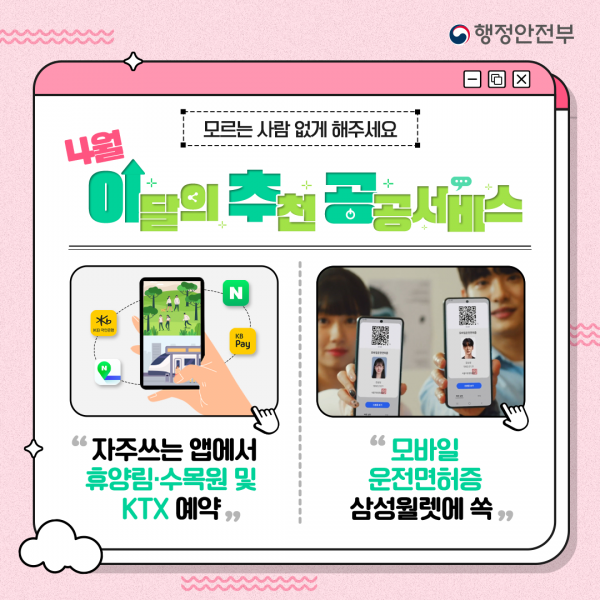 4월의 추천 공공서비스는 ‘민간앱을 통한 공공서비스 예약’과 ‘모바일 신분증’으로 봄 나들이 시즌을 맞아 열차와 휴양시설 예매 시 편의성, 각종 할인 혜택 적용 시 신분 확인의 유용성 측면에서 이달의 공공서비스로 선정됐다.