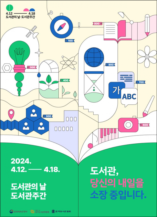 먼저 4월 11일과 12일에는 국립중앙도서관에서 ‘2024 도서관의 날·도서관주간’ 주제 공모전 당선작인 ‘도서관, 당신의 내일을 소장 중이다’를 주제로 기념행사를 개최한다.