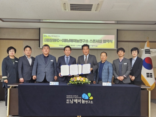 [AANEWS] 남해마늘연구소는 11일 남해마늘연구소 세미나실에서 창원FC와 상생 발전을 위한 스폰서십 협약을 체결했다.