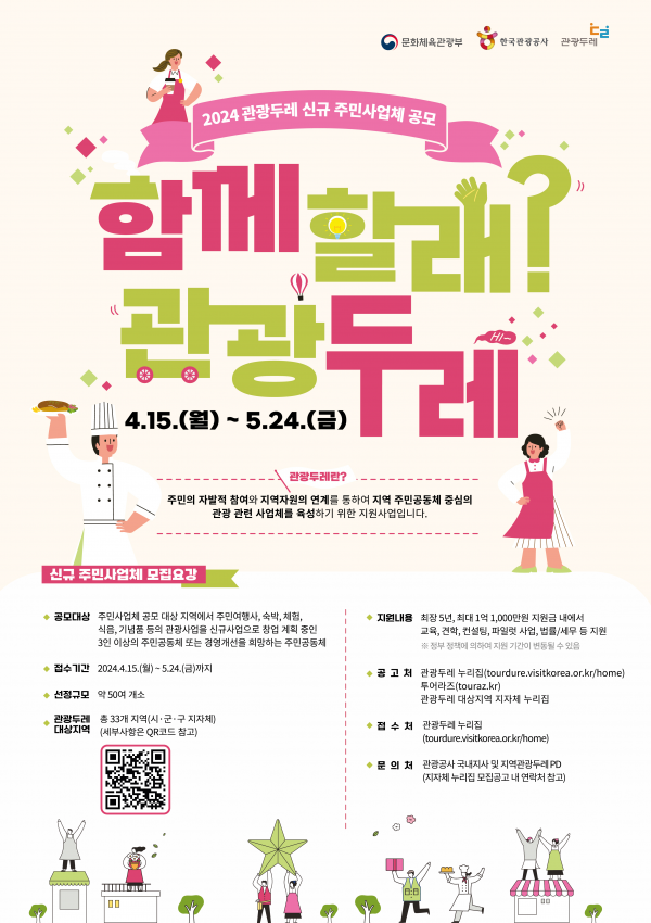 [AANEWS] 문화체육관광부와 한국관광공사는 지역주민이 주도하는 지역관광 생태계 구축을 위해 금일부터 5월 24일까지 ‘2024년 관광두레 신규 주민사업체’를 공모한다.