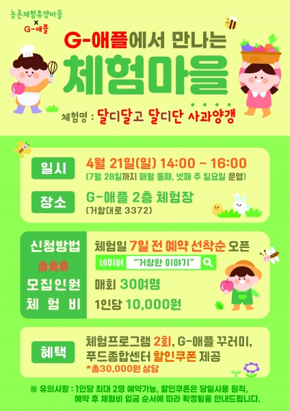 ‘G-애플에서 만나는 체험마을’(이하 ‘체험 이벤트’)은 (사)거창군농어촌체험휴양마을협의회와 G-애플, 거창푸드종합센터가 함께하는 행사로 농촌체험휴양마을에서 G-애플 공간을 활용해 참가자들이 농업을 친숙하고 재미있게 느낄 수 있도록 체험 프로그램을 구성할 계획이다.
