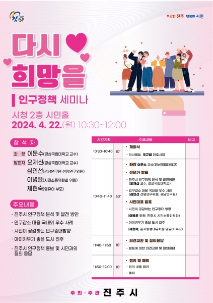 [AANEWS] 진주시는 오는 22일 오전 10시 30분 시청 2층 시민홀에서 2024 진주시 인구정책 세미나 ‘다시 희망을’ 행사를 개최한다.