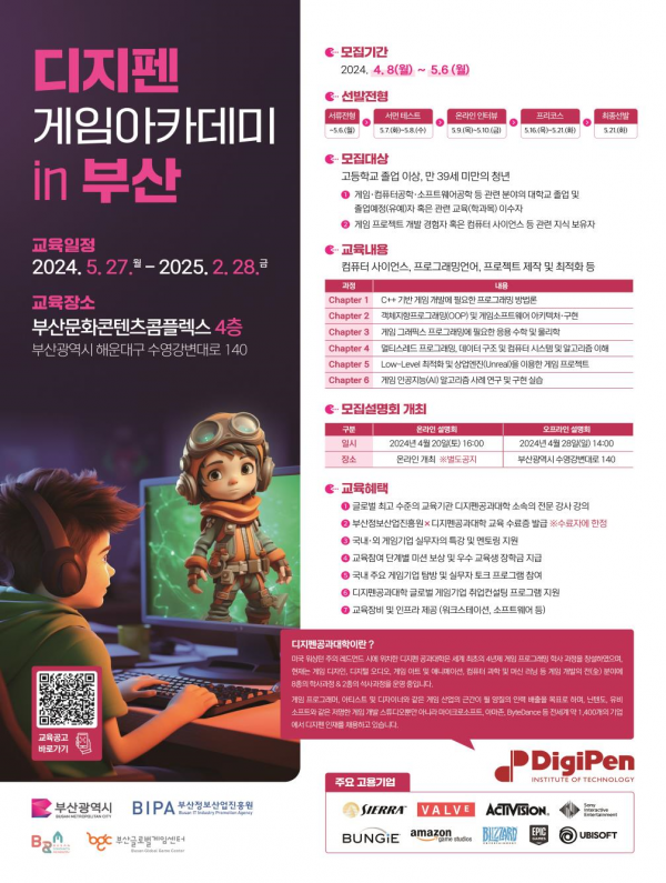 부산시는 오는 5월 10일까지 ‘디지펜 게임 아카데미 in 부산’ 과정의 수강생을 모집한다고 밝혔다.