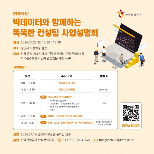 [AANEWS] 한국관광공사는 지역관광 사업의 효율적인 추진과 데이터 기반 의사결정 및 마케팅 지원을 위해 ‘2024 빅데이터와 함께하는 똑똑한 컨설팅’ 사업설명회를 4월 23일 오후 1시 30분부터 상연재 시청역점 별관에서 개최한다.