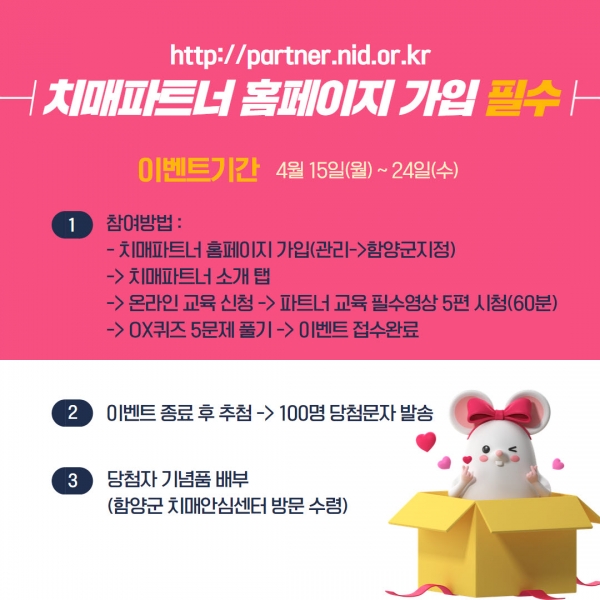 치매파트너는 치매에 대한 이해를 바탕으로 일상에서 치매환자와 가족을 배려하는 따뜻한 동반자를 말하는 것으로 함양군보건소는 이달 24일까지 치매파트너 가입 이벤트를 진행한다.
