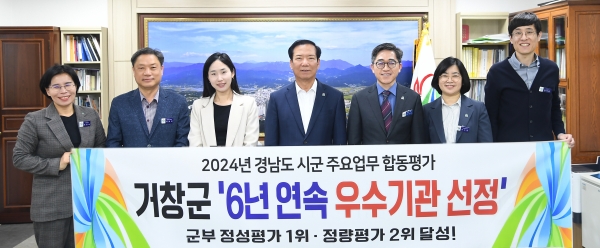 [AANEWS] 거창군은 ‘2024년 시군 주요업무 합동평가’에서 군부 정성평가 1위, 정량평가 2위를 달성해 6년 연속 우수기관으로 선정됐다고 밝혔다.