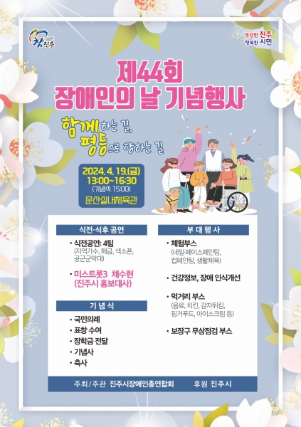 이번 행사는 진주시장애인총연합회가 주최하고 진주시가 후원하며 ‘함께 하는 길, 평등으로 향하는 길’을 주제로 해금, 색소폰연주, 공군군악대 중창단의 식전 공연을 시작으로 기념식은 모범장애인과 장애인복지증진 유공에 대한 표창 수여, 장학금 전달, 기념사, 내빈 축사 순으로 진행된다.