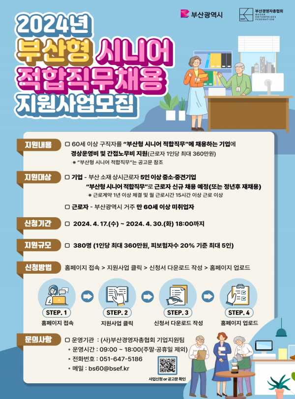 근로자 요건은 채용일 기준 부산에 거주하는 만 60세 이상 미취업자며 주 오후 3시간 이상의 파트타임 근로자, 비정규직 채용인 경우에도 가능하다.